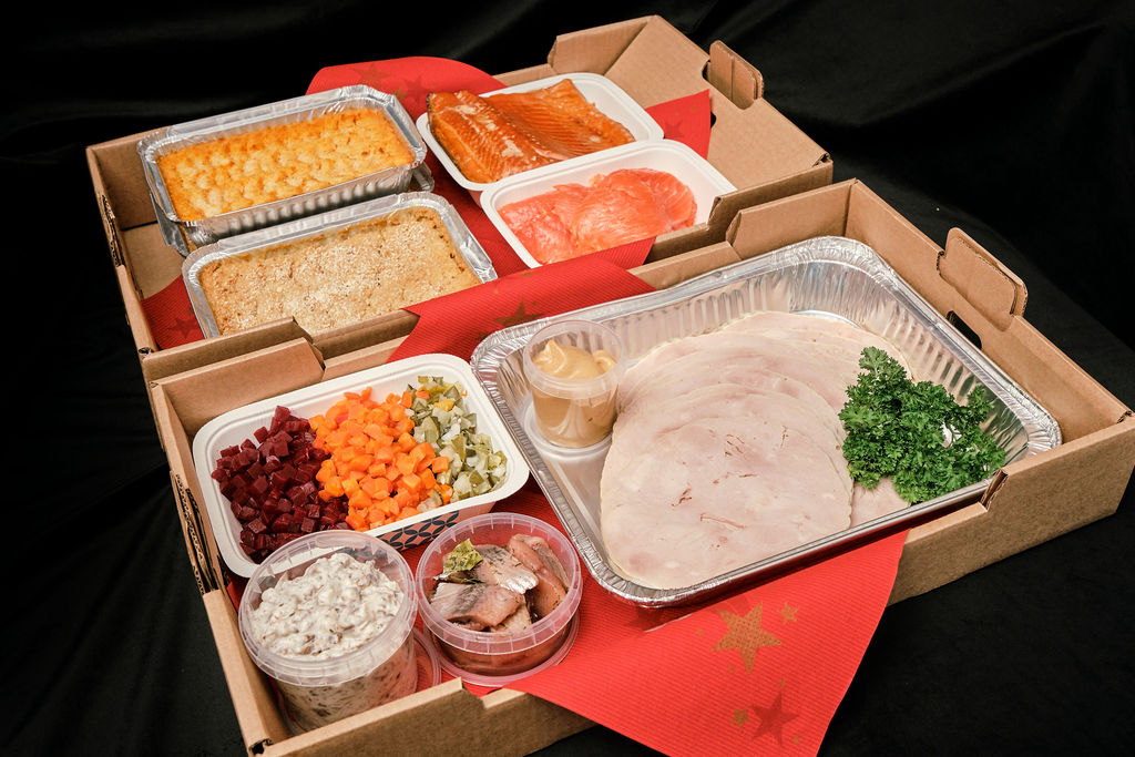 Rosolli, metsäsienisalaatti, jouluinen maustesilli, graavisuolattu lohi, savustettu kirjolohi, joulukinkkua, oman keittiön sinappi, lihapullat, lanttulaatikko, porkkanalaatikko ja perunalaatikko.
